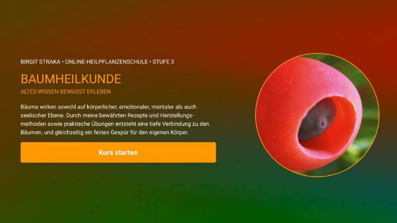 In 16 Filmen werde ich Dir 30 verschiedene Bäume vorstellen sowie ihre heilkundliche Wirkung und Verarbeitungsformen. Auch in welcher Art und Weise die Energie von Bäumen fühlbar ist und sich für den körperlichen und seelischen Ausgleich einsetzen lässt, erfährst Du in diesem Kurs.