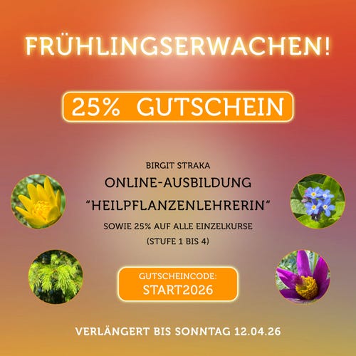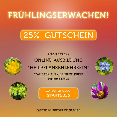 "Das Wissen, wie Du es in Deiner Online-Heilpflanzenschule vermittelst, ist einsame Spitze! Ich habe unglaublich viel gelernt! Ich musste staunen, als Du von der Signaturenlehre und Gemmomitteln erklärt hast. Da ich einst eine Medizinische Fachschule abgeschlossen habe, - Ernährungs- und Gesundheitslehre - fühle ich mich in den Themen mit dem Heilpflanzenwissen geborgen. Deine Fotos und Makroaufnahmen sind einmalig schön und machen mir eine neue Welt sichtbar."