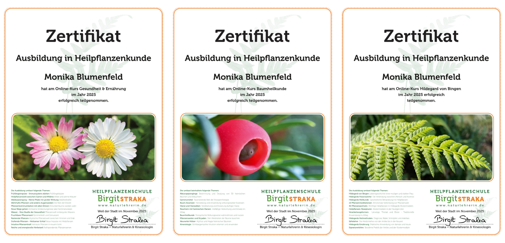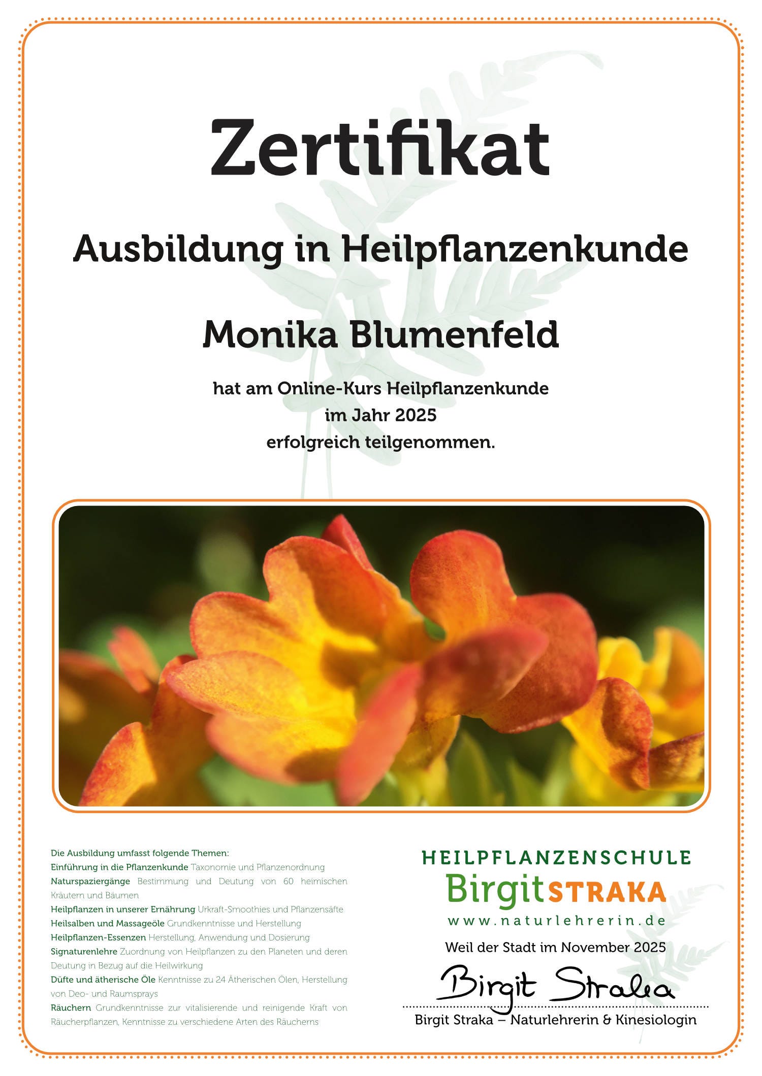 Du erhältst nach Abschluss des Kurses Dein personalisiertes Zertifikat. Dieses Zertifikat (PDF) bestätigt Deine erfolgreiche Teilnahme am Kurs "Heilpflanzenkunde" und kann als Nachweis Deines erweiterten Wissens in Deinem persönlichen und beruflichen Umfeld dienen.