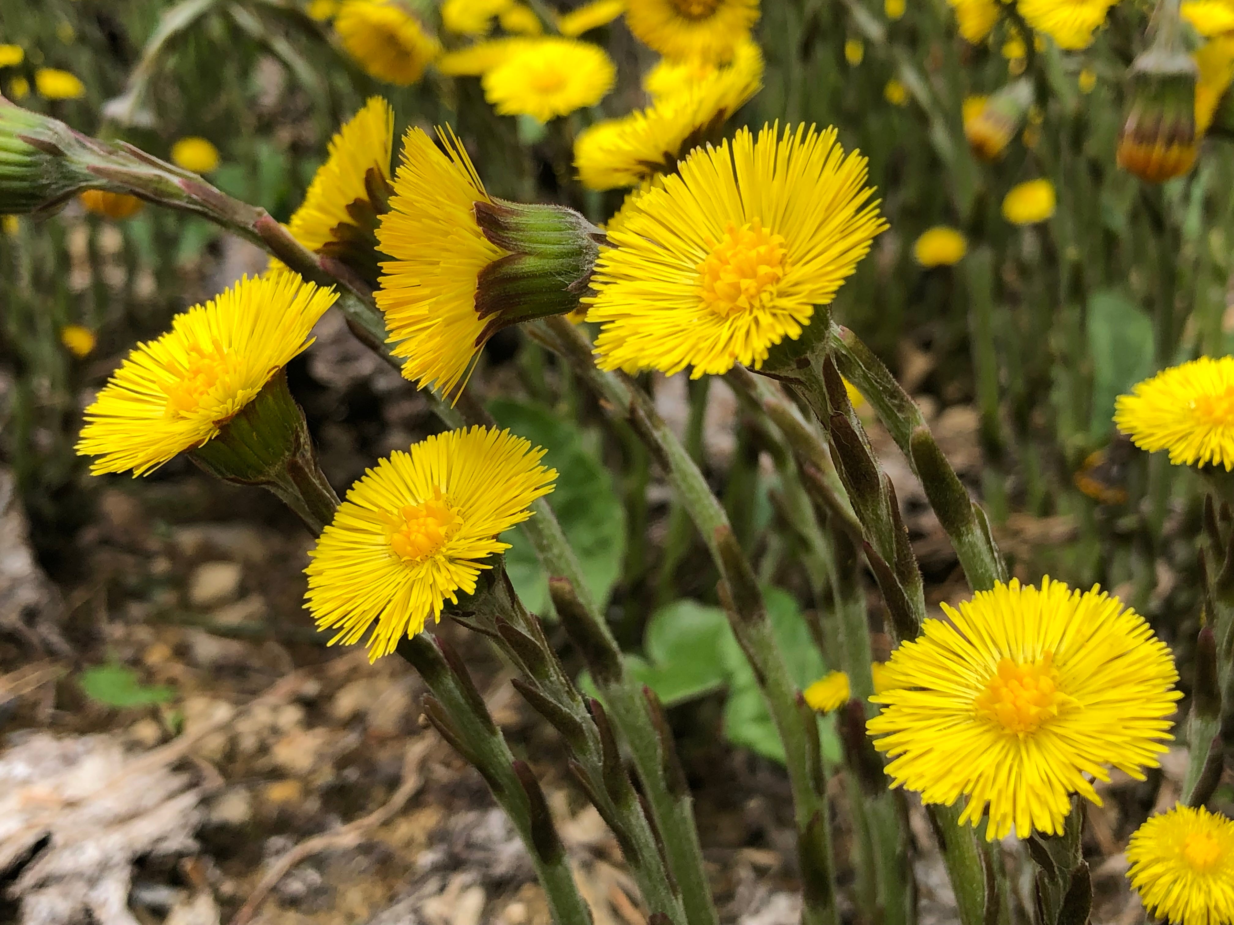 Bachblümlein, Berglatschen, Brandlattich, Brustlattich, Hufblatt, Märzblume, Rosshuf, Tabakkraut, Sommertür, Teebleaml, Sandblümel, Lehmblümel