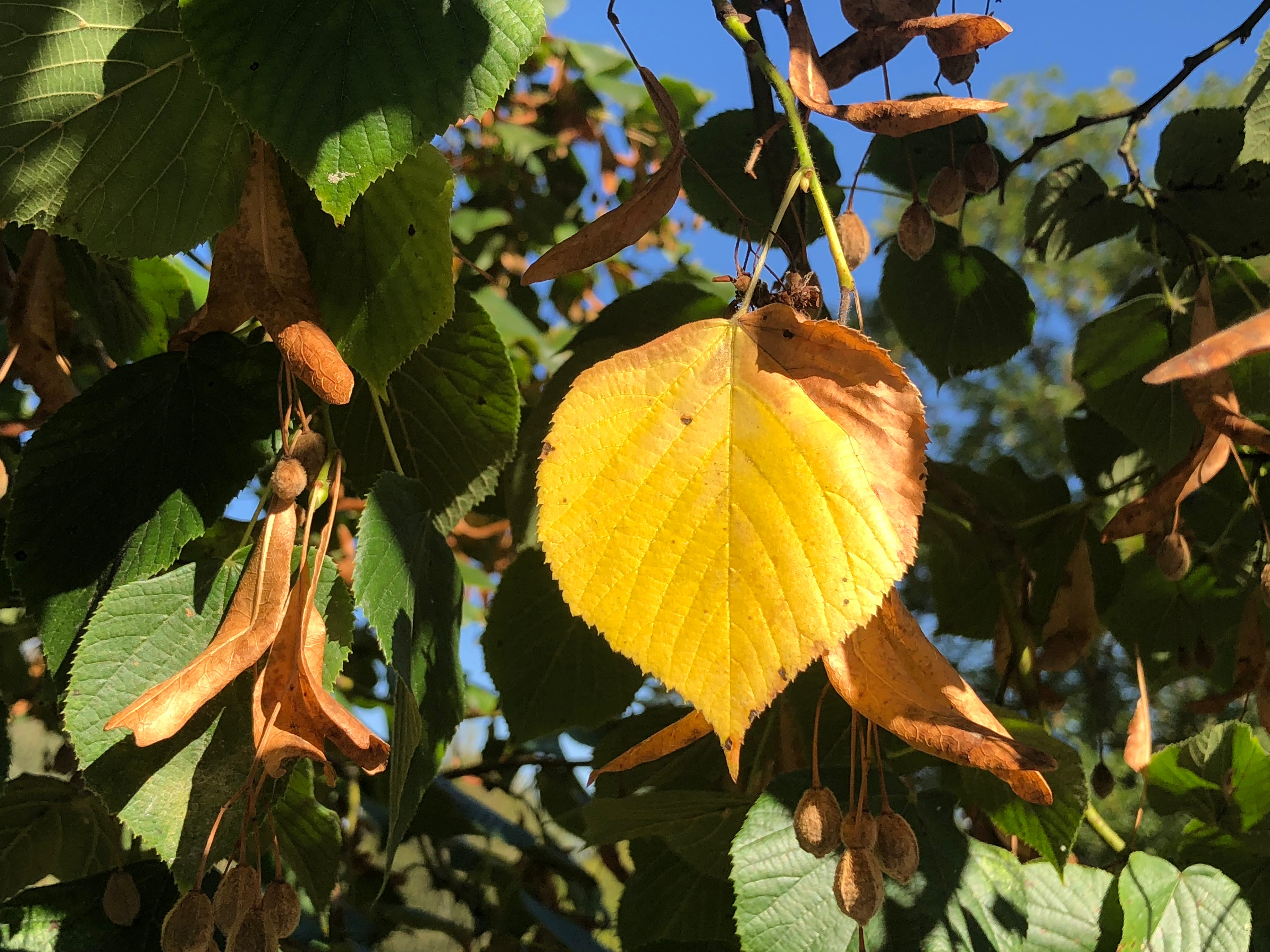 Die Blätter der Winter-Linde (Tilia cordata) sind klein, bis max. 6 cm lang. Ihre Nussfrüchte lassen sich zwischen den Fingern zerdrücken.