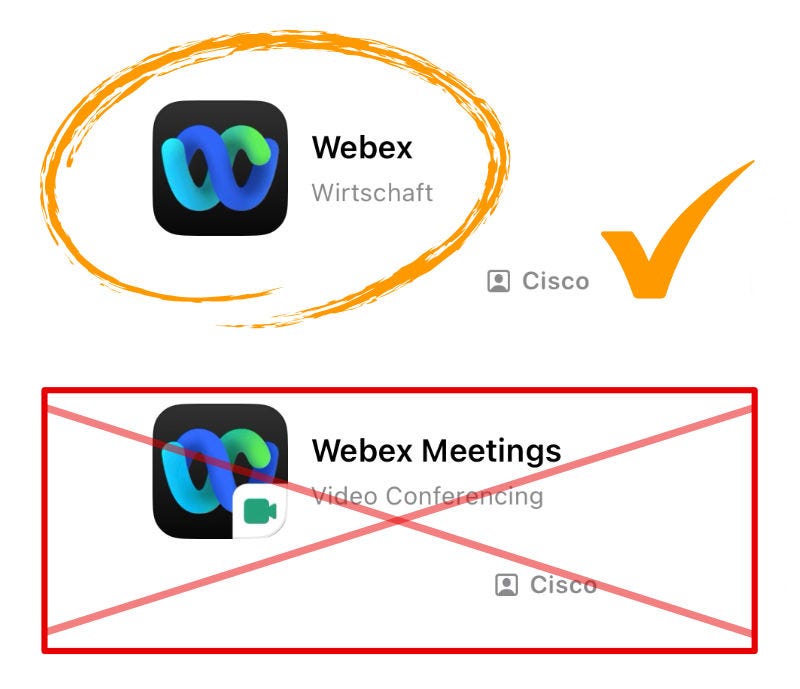 Bei Teilnahme mit Handy / Tablet musst Du vorab die kostenlose Webex-App - siehe Bild unten - installieren. Anschließend klickst Du auf den Teilnahme-Link in Deiner E-Mail und kannst direkt über die App beitreten!