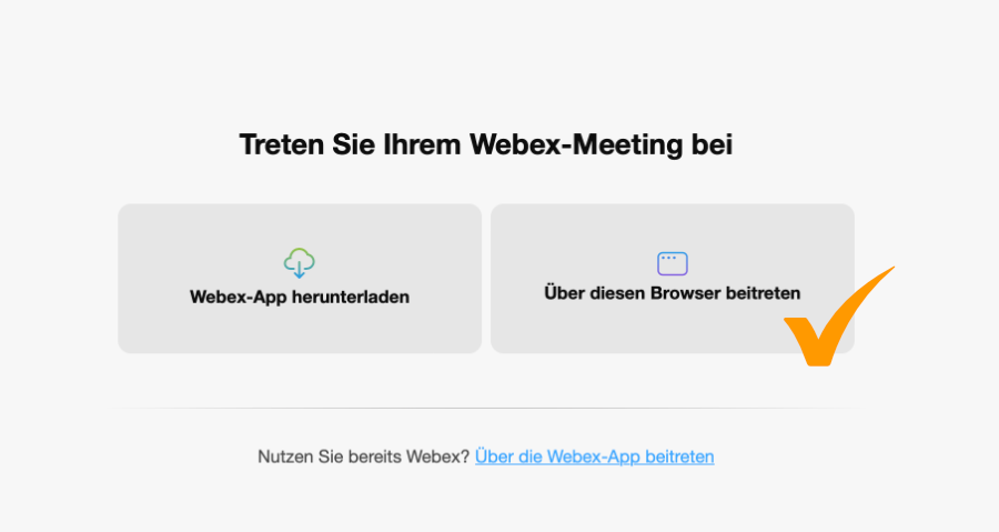 Du klickst auf den Teilnahme-Link in Deiner E-Mail und wirst automatisch zu der Website von Webex weitergeleitet. Wähle ‚Über diesen Browser beitreten‘.